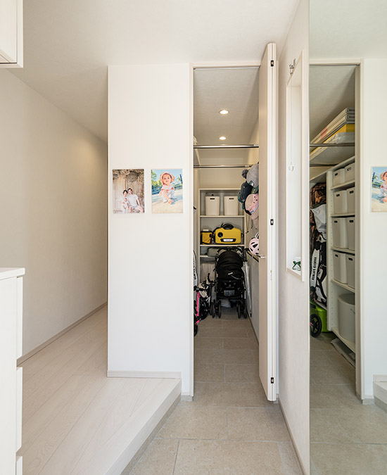 玄関土間のシューズクロークにレジャー用品も収納できて便利