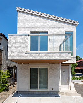 白で統(tǒng)一した片流れ屋根の外観。空中に張り出したバルコニーが印象的