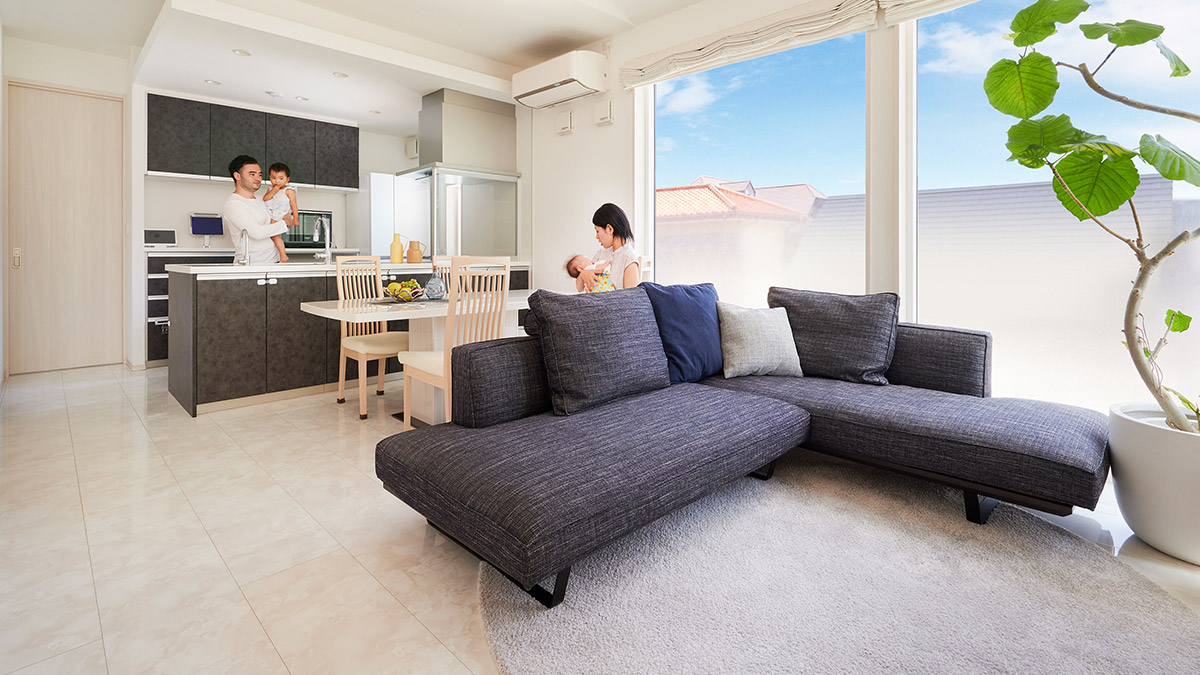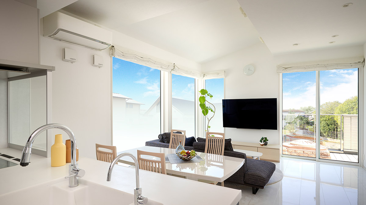 コーナーの大開口窓から光がふんだんに差し込む2階LDK。「リビングにいながら空とつながる開放感が心地いいですね」とIさま。高さ2m72cmの天井はリビングの上をさらに折り上げて、いっそうの伸びやかさを生み出しています。床は白い大理石調(diào)フロアにしてホテルライクなインテリアに。