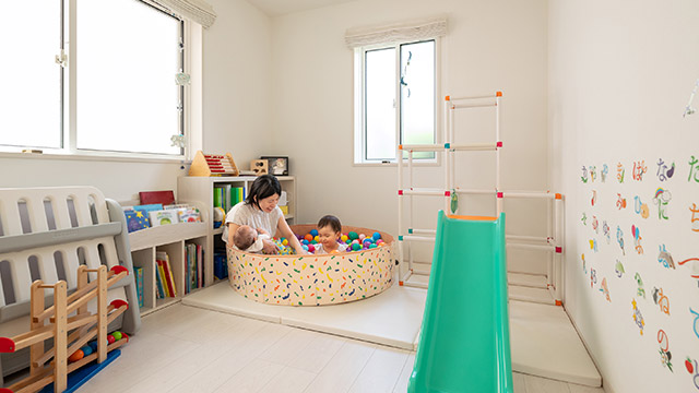 カラフルな玩具が楽しい子ども部屋。お子さまはボールプールがお気に入り