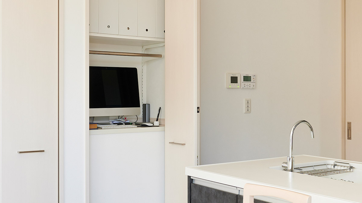 キッチン橫の収納扉を開けると、PCカウンターが現(xiàn)れます。この空間は階段室の上のデッドスペースを有効活用したもの。「キッチン家事の合間に気軽にパソコンが使えるから便利ですね。育児講座のオンラインミーティングにも使っています」とIさま。
