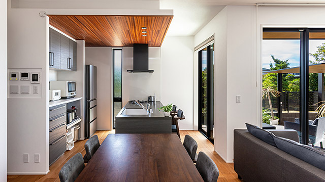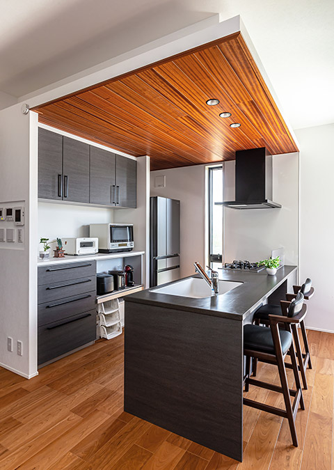 板張りの化粧天井が印象的なキッチンスペース。シックな濃いグレーのキッチンは、シンク前にハイチェアを置いてバーカウンターとしても活用。夜は化粧天井の間接照明でムードを変え、カウンターでお酒を飲んで大人の時間を楽しまれています。