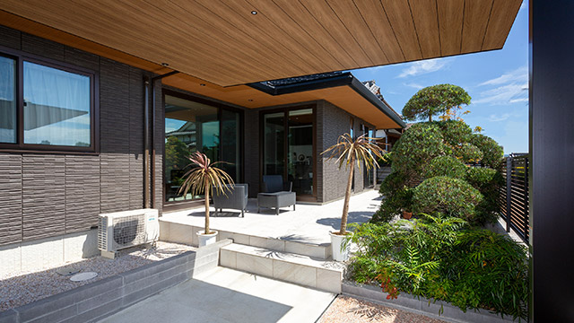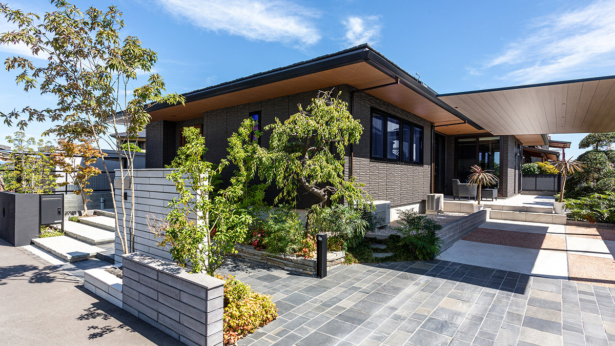 外構と美しく溶け合い、深い軒の出が落ち著きを醸し出す外観