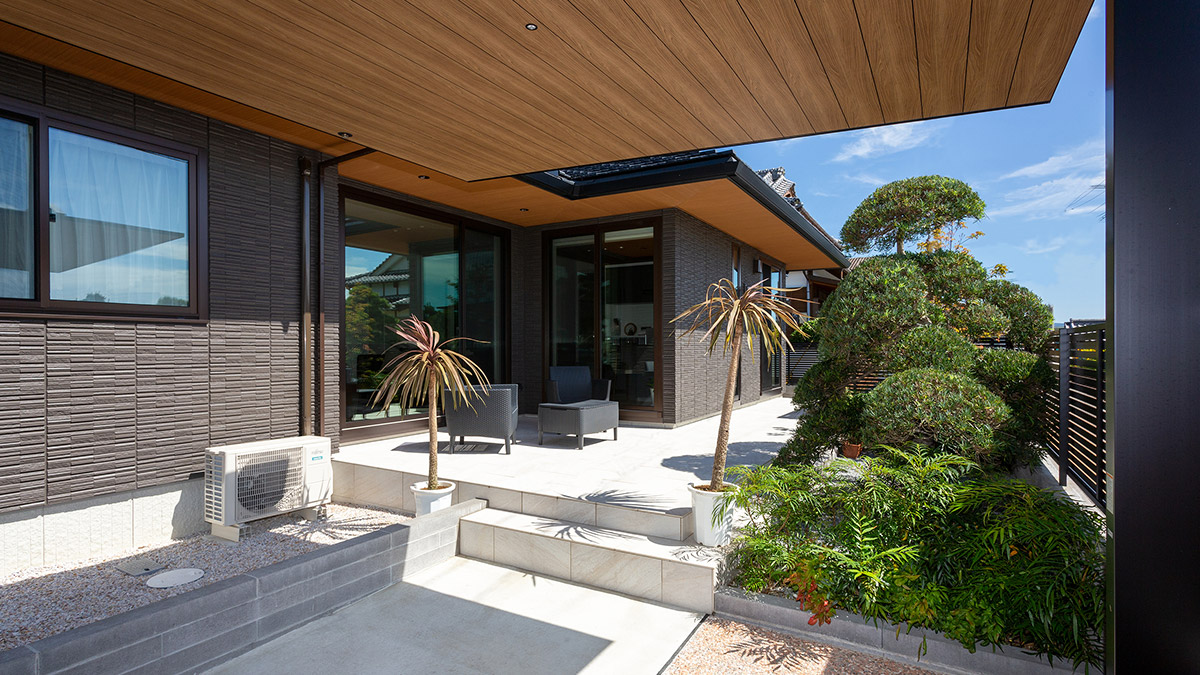 寄棟屋根の深い軒の出に守られた落ち著きのある外観。軒天の木調色と大きなカーポートの天井が調和して美しい一體感を生み出しています。床を赤茶の洗い出しとコンクリートで市松模様に仕上げたカーポートは、バーベキュースペースとしても大活躍しています。