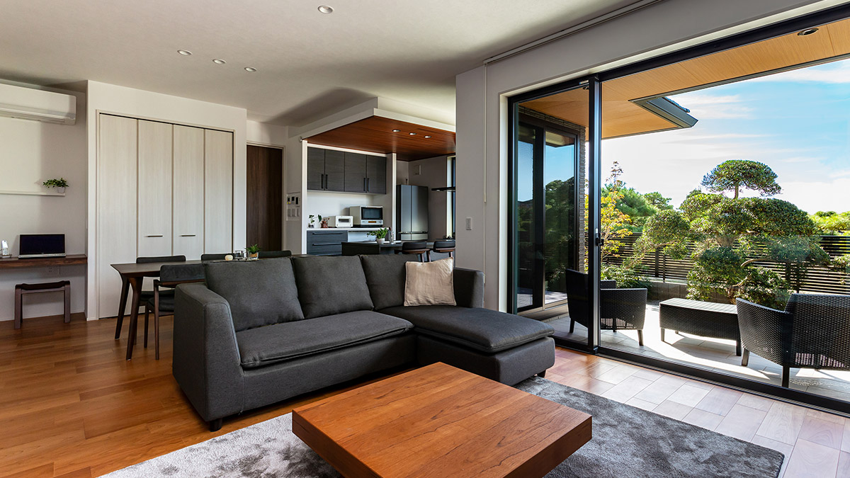 テレビを掛けたアクセント壁が重厚感を漂わせるリビング。リビングの向かい側に広がる造園の松林を借景に生かして、非日常の雰囲気を創り出しています。「ソファでくつろいでいると、テラス越しに視線が広がり、リゾート地にいるような心地よさが味わえます」とEさまは大満足のご様子です。