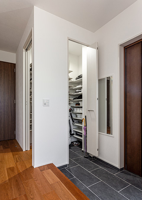 玄関ホールにはシューズクロークを設けて、ゴルフバッグなどかさばる用具も収納できて便利です。ここを家族用の玄関として使えるので、玄関土間に靴が散らかることなく、いつもすっきりときれいに保てます。