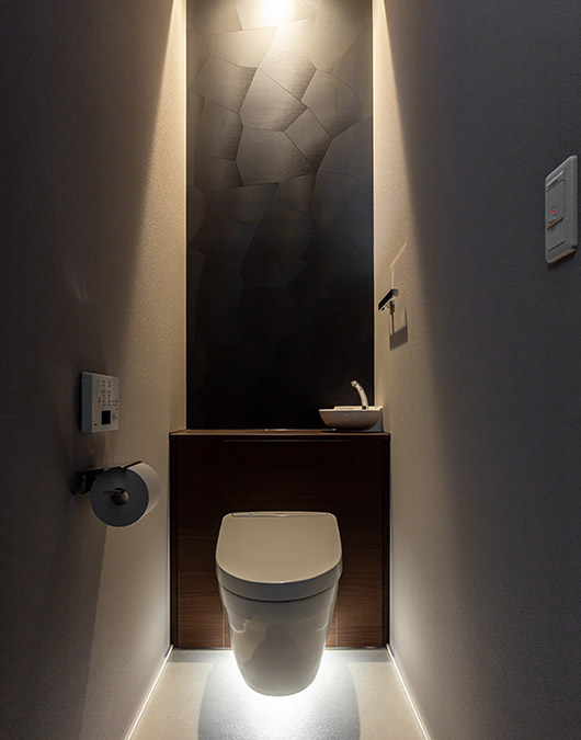 トイレは局部的に照明で照らすことで落ち著く空間に。アクセントクロスの柄が照明によって浮かび上がり印象的です。