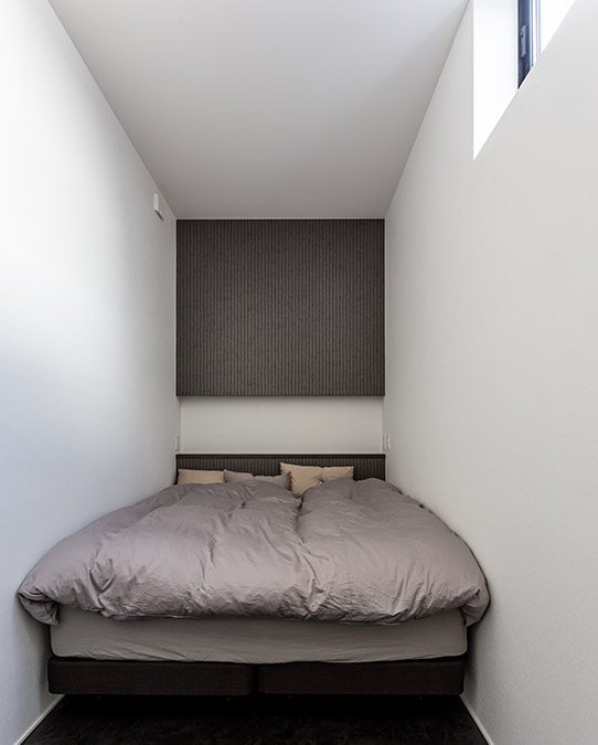 ベッドスペースはクイーンサイズのベッドがぴったり納まるサイズ。奧のふかし壁とアクセントクロスがベッドと一體化し、まとまりのある睡眠空間になっています?!柑炀撙い菠歉F屈さは全く感じません。想像以上に落ち著く空間になりました」とFさま。