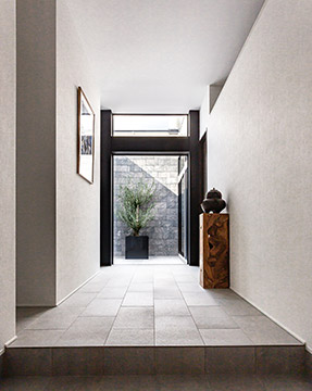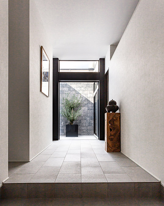 玄関を入ると奧の明るい中庭に視線が抜けます。玄関ホールの床タイルは中庭まで連続させ、外とのつながりを強(qiáng)調(diào)することで半屋外の土間のような空間に。ホールを介してLDKと洗面や主寢室が並ぶプライベートスペースを完全に分離することで、來客時(shí)も生活感を見せずにスマートに対応できるそうです。