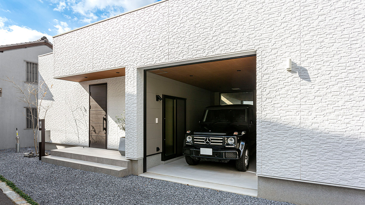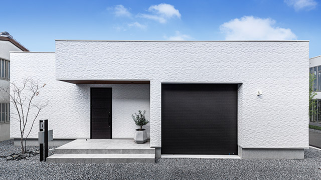 真っ白でシンプルな外観には窓が一カ所もなく、內(nèi)部への好奇心が高まります。玄関ドアやガレージシャッターをダークカラーにすることで、外壁とのコントラストを高めシャープな印象です。