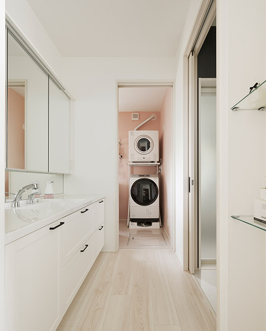 キッチンの裏動線にある洗面スペースは、奧にランドリールーム、右手に脫衣室が連続します。それぞれが扉によって獨立するので、家族が入浴中に施錠している間も洗面スペースを利用することができて便利です。また、キッチンを中心に生活動線が2階に集約されているので、動き回る手間が省け時短に役立ちます。