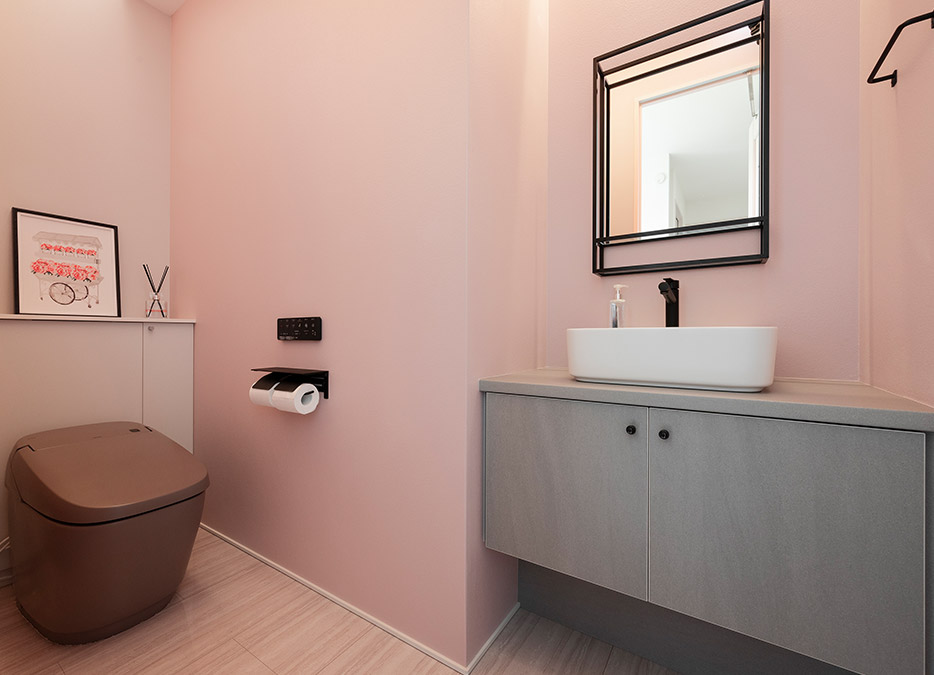 ピンクの壁が印象的なトイレは、ブラックのラインをアクセントとすることで甘くなりすぎず、シャープな印象を持たせています。
