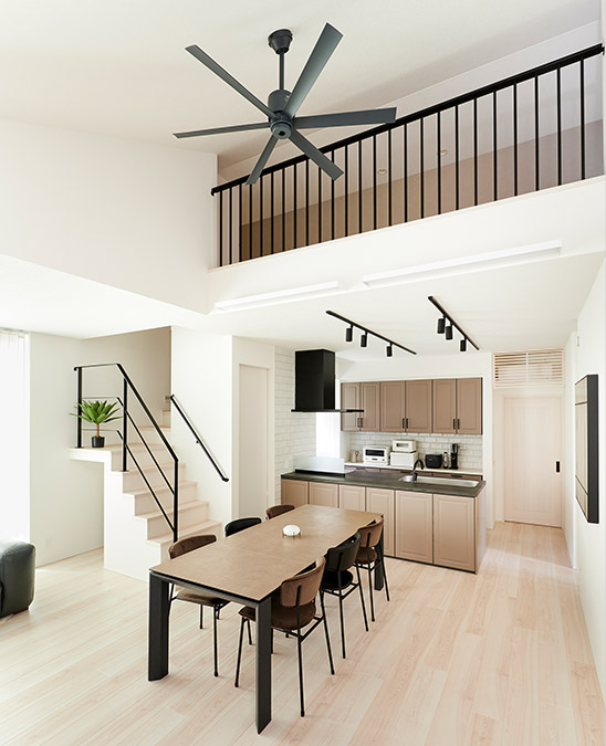 吹き抜けと勾配天井が開放的なダイニングキッチンは、リビング階段でつながるロフトによって期待感が高まります。天井高の変化が広い空間にメリハリをもたらし、魅力的に演出しています。ホワイトや淡いベージュの中に、シーリングファンなどのブラックカラーがアクセントとなりシャープな印象です。