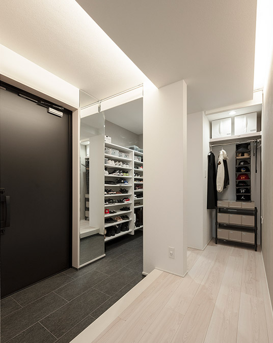 玄関の折下げ天井と間接照明は廊下へ連続し、LDKへつながる階段まで誘導します。照明は間接照明のみとすることで、天井面をすっきり美しく見せられます。土間続きのシューズクロークを通り抜けて出入りすることもでき、帰宅時の片付けがスムーズです。