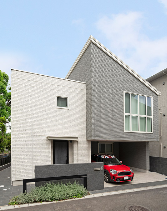 屋根形狀で変化を付けたツートンカラーの外観