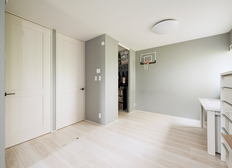1階の広い個室はドアや収納を2カ所に設けており、今後お子さまたちの成長に応じて壁で間仕切り、2部屋に分けることが可能です。ライトグレーのアクセントクロスは幅広いテイストに合わせやすく、おのおのの個性を引き立てます。