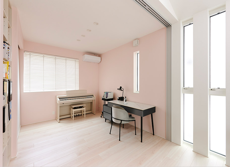 リビングに隣接する個室は、半透明パネルの建具を開閉することでフレキシブルに使えます。床にレールがない吊りタイプなので、床続きの一體感が得られます。ピンクのクロスはブラックやグレーとの組み合わせで甘くなりすぎず、LDKに優しい印象を與えています。