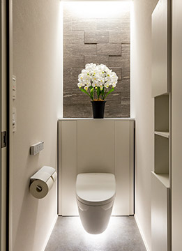 清潔感漂うホワイトをベースにデザインしたトイレ。天井と足元に施した間接照明によって、柔らかい光が全體にまわり込み優しく照らします。正面の化粧壁が生み出す陰影が、シンプルな空間のアクセントになっています。