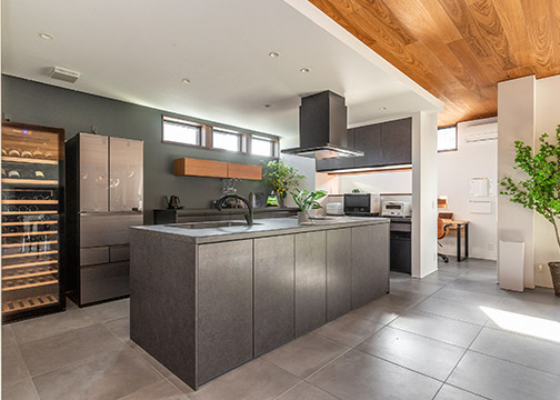 そば打ちやパン作りなど、食関連の趣味を愉しみたいというMさま。広々としたオープンスタイルのキッチンは家族で囲んで料理ができ、セラミック素材のダイニングテーブルは清掃性が高く便利だそうです。奧のスタディコーナーとの間仕切り壁は、途中を開けているので視線や光が通ります。