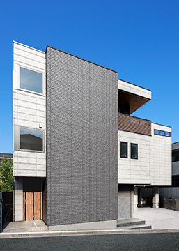 1、2階は事務所併用、3階はLDKと2つの機能を持つMさま邸。ツートーンの外壁を縦に張り分けて建物全體のシルエットにメリハリを加えるとともに、一體感をもたせています。フラットルーフのモダンな印象が、インテリアとリンクする外観です。