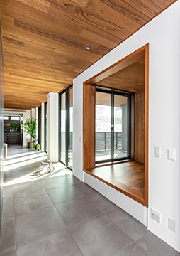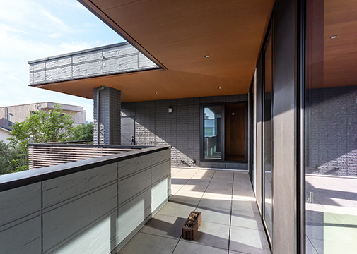 3階LDKとつながる広々としたバルコニーは空に近い庭のような場所。プランターで家庭菜園をしたり、時には外で朝食を食べたりと、屋外空間を自由に愉しめます。テーブルセットをしまえるように、バルコニーから出入り可能な物入れを設置。木目のデザインが施された軒天やタイル張りの床によって、室內との連続感を高めたアウトドアのリビングです。