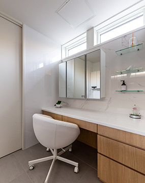 広いカウンターやガラスの飾り棚などを設けた、明るいパウダーコーナー。演色性に優れたミラーと一體のキャビネットは美顔器も入る奧行きがあります。背後には洗面臺があるのでメイクやスキンケアの合間に気軽に手洗いができるなど、機能性も十分に備えた美容意識が高まる空間です。