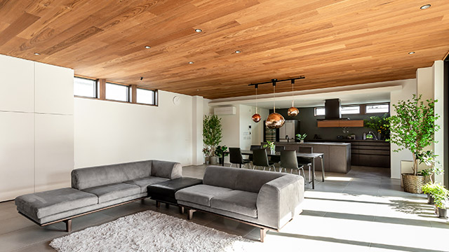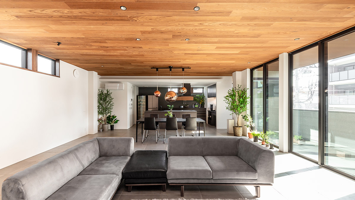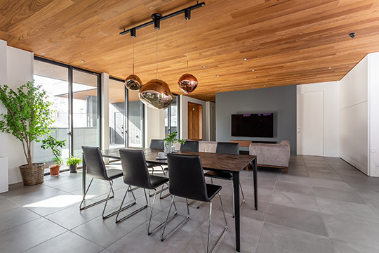 ライトグレーのタイル床など、モノトーンを中心にコーディネートしたモダンなLDK。ホワイトの収納扉は壁に溶け込ませるようにデザインするなど、無駄を排除した端正な空間です。天井に張ったチーク材の素材感が溫かみをプラス。また、ダイニング上にリズミカルに配されたペンダント照明が遊び心を感じさせ、個性豊かなアクセントになっています