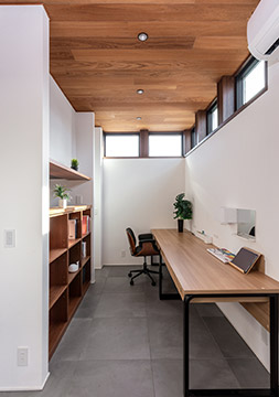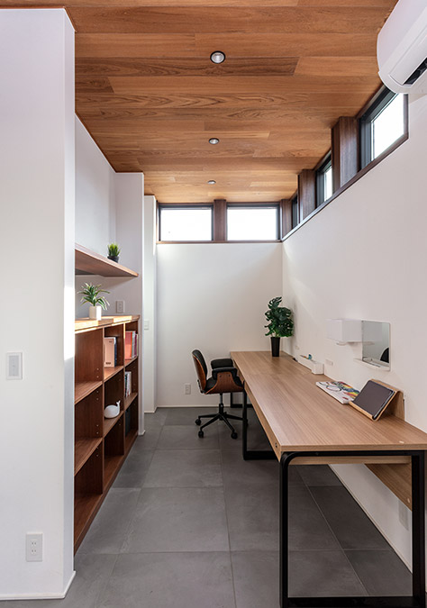 本棚の上でキッチンとつながるスタディコーナーは、ハイサイド窓からたっぷり取り込んだ光がキッチンまで屆くほど、明るさに満ちています。キッチンで料理をしながらお子さまが勉強する姿を見守り、聲掛けもできて便利です。また、將來は趣味のスペースなどフレキシブルに使うことを想定して、デスクは置き家具にしています。