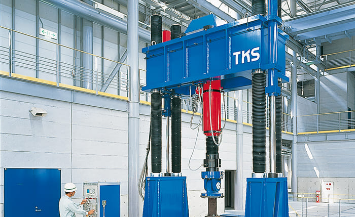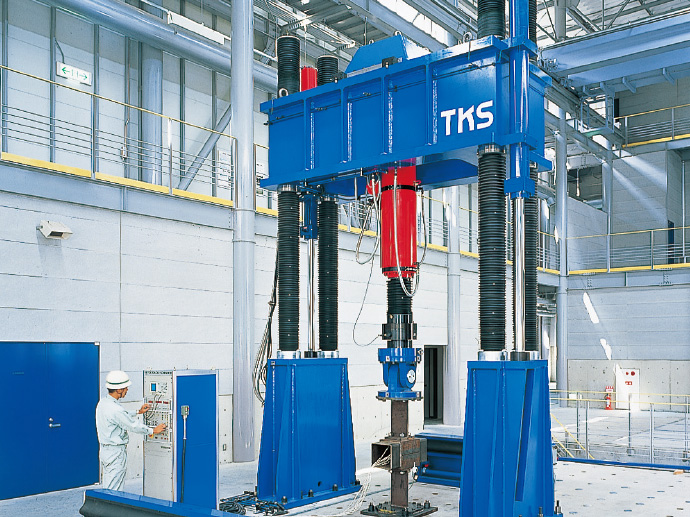 構造骨組みの一部を試験體として、試験體サイズ、加力方法に応じて多彩な載荷フレームを組み、地震や臺風に相當する大きな荷重を油圧ジャッキで加力、構造安全性を検証します。反力壁?反力床は多彩な試験に対応すべく、數千kNの反力を受け止めることが出來る鉄筋コンクリート造です。