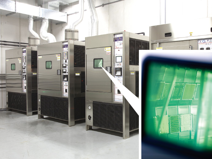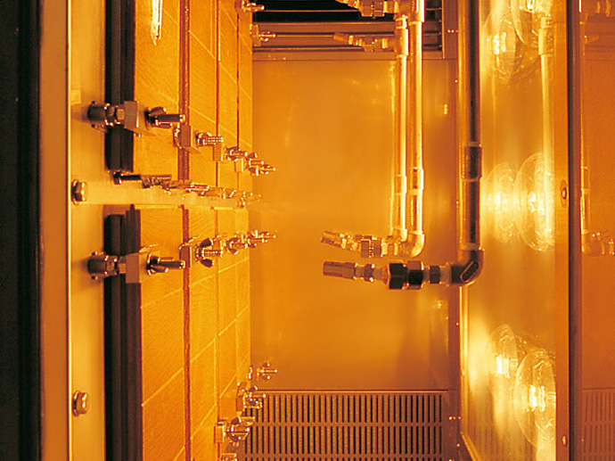 外裝材に日射?降雨を繰り返し與えて、劣化させる裝置です。屋外?屋內想定の2室間に外裝材を設置して個別の溫度?濕度條件を與え、外裝材が受ける溫度差を再現、検証します。