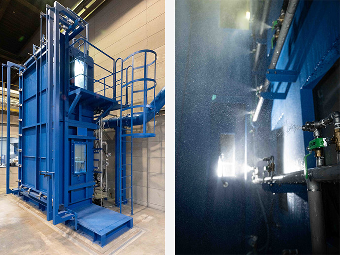 建物が受ける風圧と降雨を再現する試験裝置です。臺風を再現して風圧と同時に降雨を想定した水を散水することで外壁の目地などの水密性や耐風性の評価?検証を行います。