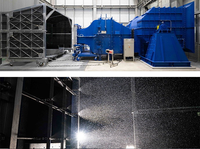 建物が受ける風や降雨を再現できる試験裝置です。暴風雨を再現して風と降雨を想定した水を散水することで、建物各部位の防水性や耐風性の評価?検証を行います。