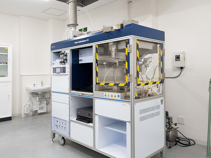 コーンカロリーメーターのヒーターで、建物を構成する材料の加熱試験を行い、酸素の消費量から発熱量や発熱速度を確認します。