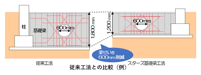スターズ基礎(chǔ)梁工法は、鉄筋コンクリート造基礎(chǔ)梁に點検用人通孔等として設(shè)けられる大開口貫通孔の補強工法です。星形補強筋等を用いた効率的な補強により、直徑が梁せいの3分の1以下となる貫通孔を設(shè)けることができる業(yè)界トップクラス(※1)の貫通孔補強工法です。本工法により梁せいを抑えることができ、コンクリート量や廃土量が削減できるため、環(huán)境負荷や工事費を低減できます。(株式會社フジタとの共同開発)