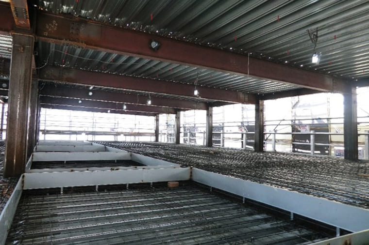 橫補剛材省略工法は、床スラブ付き鉄骨梁を対象に、床スラブによる補強効果を利用して???????、鉄骨梁の橫補剛材を省略する工法です。本工法を用いることで、一般に鉄骨梁の橫座屈現象(※)を防ぐために必要とされる橫補剛材の配置が不要となり、構造安全性を確保しつつ省力化、省施工化できます。(日本製鉄株式會社との共同開発)