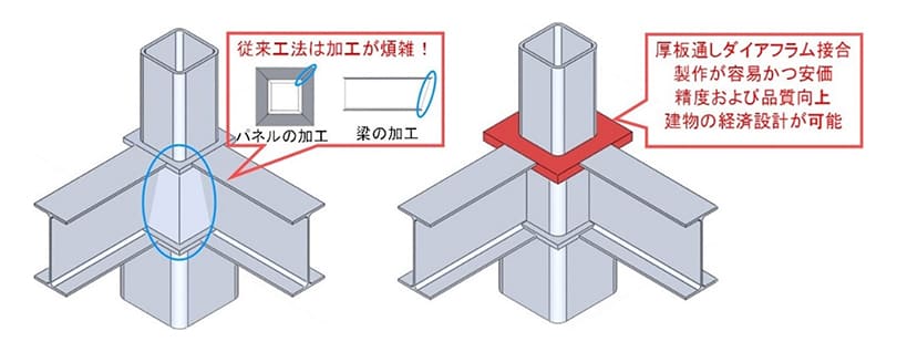 異徑柱接合工法は、上下階の柱サイズが異なる柱梁接合部パネルにおいて、絞り加工が不要な工法です。鉄骨造における柱梁接合部の容易かつ安価な製作を実現し、接合部の品質向上に貢獻します。(株式會社フジタとの共同開発)