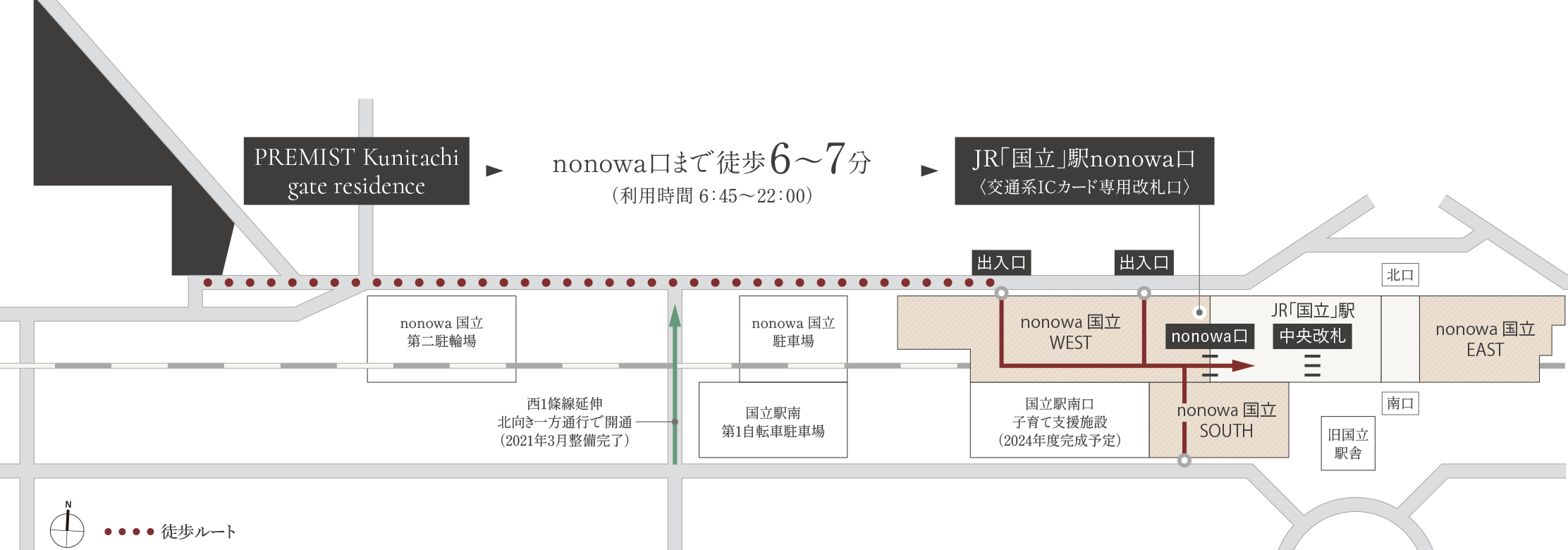 エリア概念イラスト2009年より再開発が行われているJR「國立」駅。2016年4月に「nonowa 國立WEST」が開業、回遊歩行空間「ののみちクニタチ」が整備されたことで、改札口や高架下エリア、周辺地域への回遊性が向上しました。
