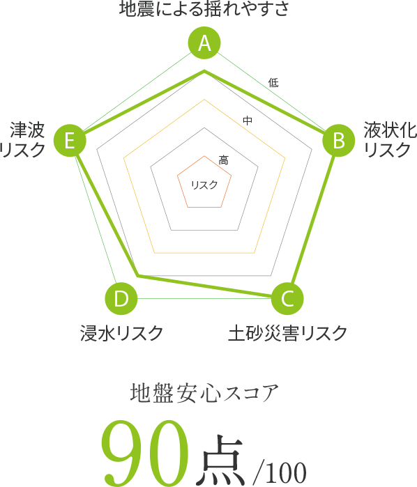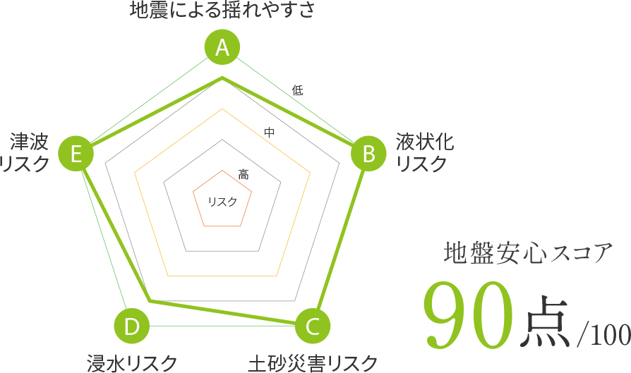 災害時の地盤リスクを総合的に判定する「地盤カルテ」の診斷において、現地は100點中90點を獲得。浸水や土砂災害などが起きにくい地盤であることがデータ上でも示されています。