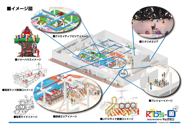 (2)仕事をテーマとした体験型子どもテーマパークの“KIDS-0(キッズゼロ)” 本物の「ものづくり」をテーマに、子どもたちが遊びを通じて仕事に興味を持ち、関心を持たせることができる場をつくりました。施設内で子どもたちが新商品の開発現場や大人たちが働く姿を通して「気づき」を発見する体験型施設です。 施設名称の由来は、「ものづくり」の原点を0から見せる。0からの出発、0からモノを生むなど、子どもたちもものづくりも、全ては0から始まるということから “KIDS-0(キッズゼロ)”と名づけました。 “KIDS-0(キッズゼロ)”の施設内は4つのエリアで構成されており、乗り物や探検を通して「ワクワク・ドキドキ」しながら「ものづくり」を実際に体験します。 当施設の企画・運営は、BLDオリエンタル株式会社(本社:大阪府泉佐野市、社長:越智やすし)が行います。BLDオリエンタル株式会社は、国内外の大型ショッピングセンターや百貨店に屋内遊戯施設を展開している企業です。