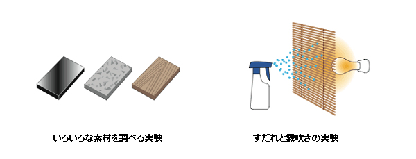 <実験内容> ①体感実験(4つ) 金属や木などの素材に実際に触れてみたり、すだれと霧吹きを使って温度の違いを感じるなど、「見て・さわって・感じる」実験を行います。