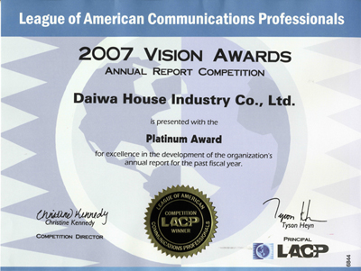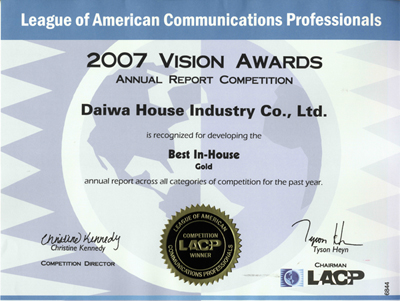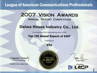 【LACPによる講評(抜粋)】 「大和ハウス工業の今年度のアニュアルレポートは、この厳しいコンテストの中でも注目に値する評価を受けました。今回は世界20カ国以上、3,000社以上の応募があり、全応募団体のうち23.3%がフォーチュン1000の企業です。同じく33.9%がフォーブス・グローバル2000の企業です。」 「大和ハウス工業のアニュアルレポートは全体として大変優れていました。今回の最高得点は99点で、大和ハウス工業のアニュアルレポートは98点でした。第一印象がすばらしく、表紙やシェアホルダーに向けてのレターも卓越していました。堅調な財務情報に裏付けられた内容も秀逸でした。」 「全体のクリエーティブも、大和ハウス工業の今年度の主題を明確に伝えており、すばらしいものでした。読者にとって重要な情報へのアクセシビリティも、注目に値します。」