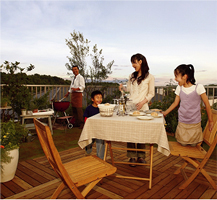 芝生システムを用いて屋上を緑化することで、家族や友人とのコミュニケーションを楽しめる菜園となります。プランターに植えたハーブの香りが“くつろぎ”を演出し、開放感あふれる“おもてなし”の空間としても利用できます。