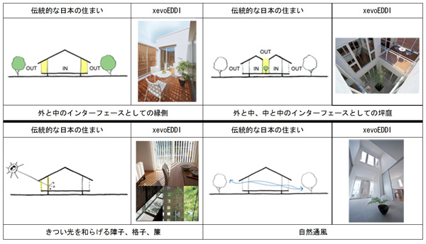 ■商品コンセプト「日本の美しい住思想」 「xevoEDDI」は、エネルギーを消費しながら快適な環境を人工的につくるのではなく、「インターフェース(中間領域)」を介して、自然の風や光を家の中に取り込むことで、無理なく室内に居ながら外を感じられる快適な空間を提案します。