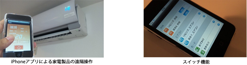 2.住宅APIを活用した家電製品の制御(リモートマネジメント) 新開発の共通プラットフォームを実証実験棟に組み込み、「iPhone」(※5)や「デジタルフォトフレーム」を利用して、各メーカーの家電機器や住宅設備機器の遠隔操作や自動制御などの動作確認を行います。 ※5.「iPhone」はApple Inc.の商標です。 (1)携帯アプリ(iPhoneアプリケーション(※6))で開発した統合リモコン iPhoneアプリケーション(※6)を利用して、住宅内の家電製品や各居室の照明の操作するソフトウェアを開発しました。 ※6.Apple社が提供している開発者向けプログラム。「iPhone」で操作できるリモコンソフト機能は、このプログラム機能を利用して開発したものです。