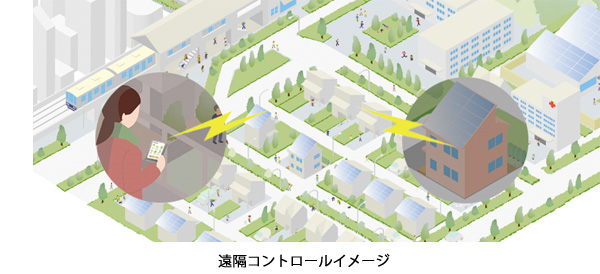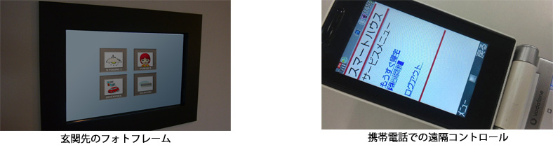 (2)玄関先に設置した「デジタルフォトフレーム」によるお出かけボタン 玄関先に設置した「デジタルフォトフレーム」のボタンで、消灯や施錠をすることができます。わざわざ各居室に出向かなくても、お出かけの準備を玄関先で行うことができるため、大変便利です。照明、エアコンの消し忘れもなく、「環境」「家計」「安全」にもやさしいサービスです。 (3)外出先からの遠隔コントロール 携帯電話のインターネット接続機能を使って、外出先から家電製品・住宅設備機器の遠隔コントロールが可能です。玄関の閉め忘れも確認・操作できます。また、帰宅前に各居室の照明をつけたり、エアコンをつけたり、お風呂を沸かすこともできます。