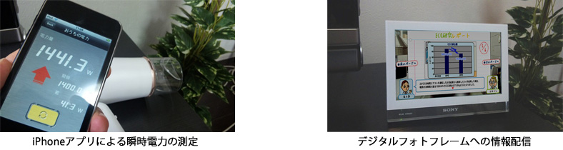 4.省エネの“気付き”情報の配信(ライフスタイルマネジメント) 「エネルギーの見える化」のサービスとして、「携帯電話」や「デジタルフォトフレーム」「テレビ」で、消費電力を確認でき、あわせて、省エネ生活を喚起するためのお知らせやお得な情報などを配信します。 (1)エネルギーの見える化サービス 住宅全体の消費電力や各部屋の消費電力を、「携帯電話」「デジタルフォトフレーム」「テレビ」などで確認できます。加えて、気軽に家庭内でできるエコアイデアやお得な電力料金メニューのお知らせなど、省エネ生活を喚起する“気付き”情報を「携帯電話」「デジタルフォトフレーム」「テレビ」へ配信します。