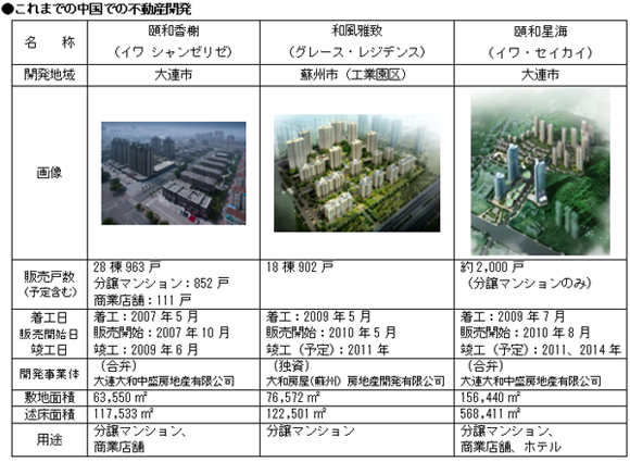 2007年5月より、大連市において初めて分譲マンション「頤和香?(イワ?シャンゼリゼ)」を手がけ、28棟963戸の分譲マンションおよび商業店舗を販売しました。2009年5月には、蘇州市において日系企業初の獨資(※1)による、18棟902戸の分譲マンション「和風雅致(グレース?レジデンス)」を開発。2009年7月からは、大連市において日系企業が中國において開発する物件としては最大級の約2,000戸の分譲マンション?商業施設の複合開発「頤和星海(イワ?セイカイ)」を開発しています。