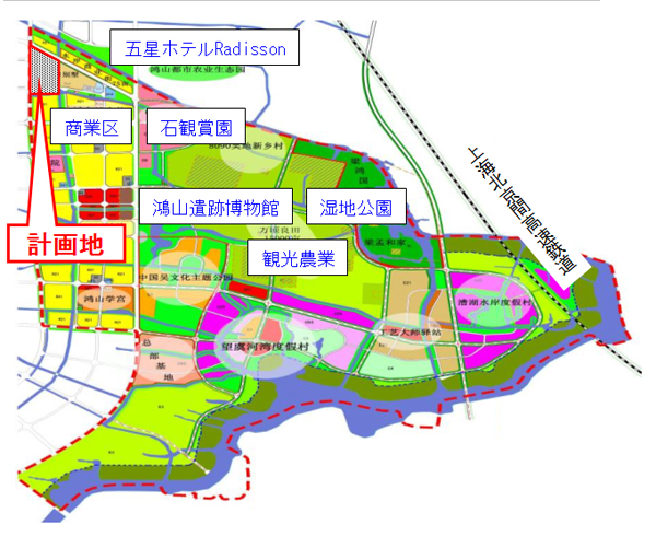 4.無錫新区内での開発 無錫市は長江デルタ(※3)の中心地帯に位置する、工業団地が整備された経済都市です。1992年に国家レベルの経済開発区である「無錫新区」を開発、多くの日系企業が進出しています。市の南側には太湖、北側に長江があり、恵まれた自然環境のため、海外からの投資も盛んな地域です。 今回開発する「(仮称)無錫呉博園プロジェクト」は、無錫市の中心地から東南に位置し、2010年7月に開業した南京と上海を結ぶ都市間高速鉄道の「無錫新区」駅まで約9kmと近く、高速鉄道を利用した場合、上海まで約40分で到着します。また、当開発地区は、無錫空港から約7km、高速道路のインターまで約1 kmと利便性の良い場所に位置しています。 ※3.中国の上海市と江蘇省・浙江省の長江