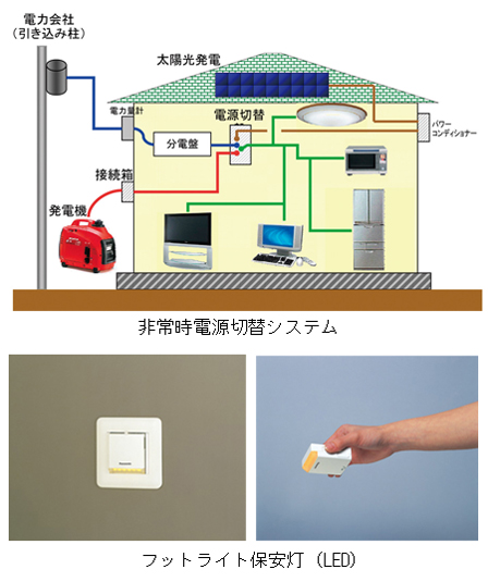 停電時、電力が復旧するまでに、必要最低限の電気を太陽光発電システムにより供給できる「非常時電源切替システム」や、停電時に自動点灯し、懐中電灯としても使える「フットライト保安灯(LED)」を標準装備しました。 |