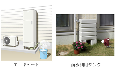 オール電化仕様を採用した場合、非常時には「エコキュート」の貯湯ユニットのお湯(水)を生活用水として、最大約4日(※2)利用できます。 また、平常時は庭木の水やりとして利用でき、非常時はトイレなどの生活用水として利用することができる「雨水利用タンク」も提案します。 ※2.エコキュート370リットル、4人家族(洗濯など20リットル/人・日)の場合 |